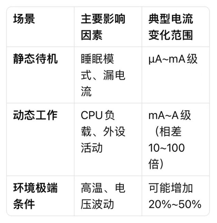 动态调频调压(DVFS):CPU频率/电压动态调整会实时改变电流(如从1GHz降至100MHz可减少50%以上电流)。
